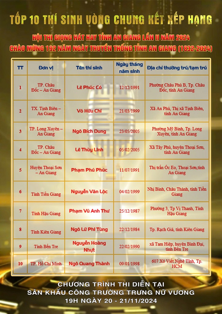 Hướng đến kỷ niệm 192 năm Ngày truyền thống tỉnh An Giang (1832-2024), Trung tâm Văn hóa Nghệ thuật tỉnh An Giang đã long trọng tổ chức Hội thi Giọng hát tỉnh An Giang lần II năm 2024, diễn ra từ ngày 3/11 với hai vòng sơ tuyển trước khi đến với vòng Chung kết, thu hút sự quan tâm và tham gia của đông đảo thí sinh từ các tỉnh, thành phía Nam tham dự.