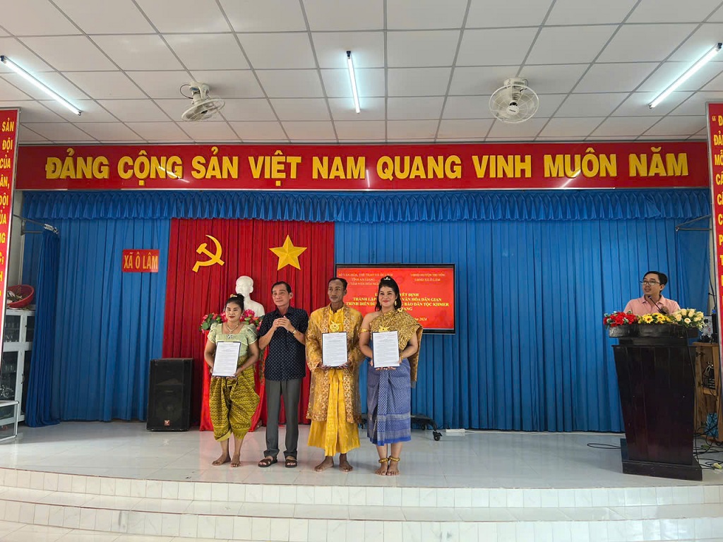 ông Nguyễn Văn Đông – Giám đốc Trung tâm Văn hóa Nghệ thuật tỉnh An Giang trao quyết định thành lập Câu lạc bộ cho Ban Chủ nhiệm Câu lạc bộ Văn hóa dân gian trình diễn Dì kê của đồng bào dân tộc Khmer tỉnh An Giang